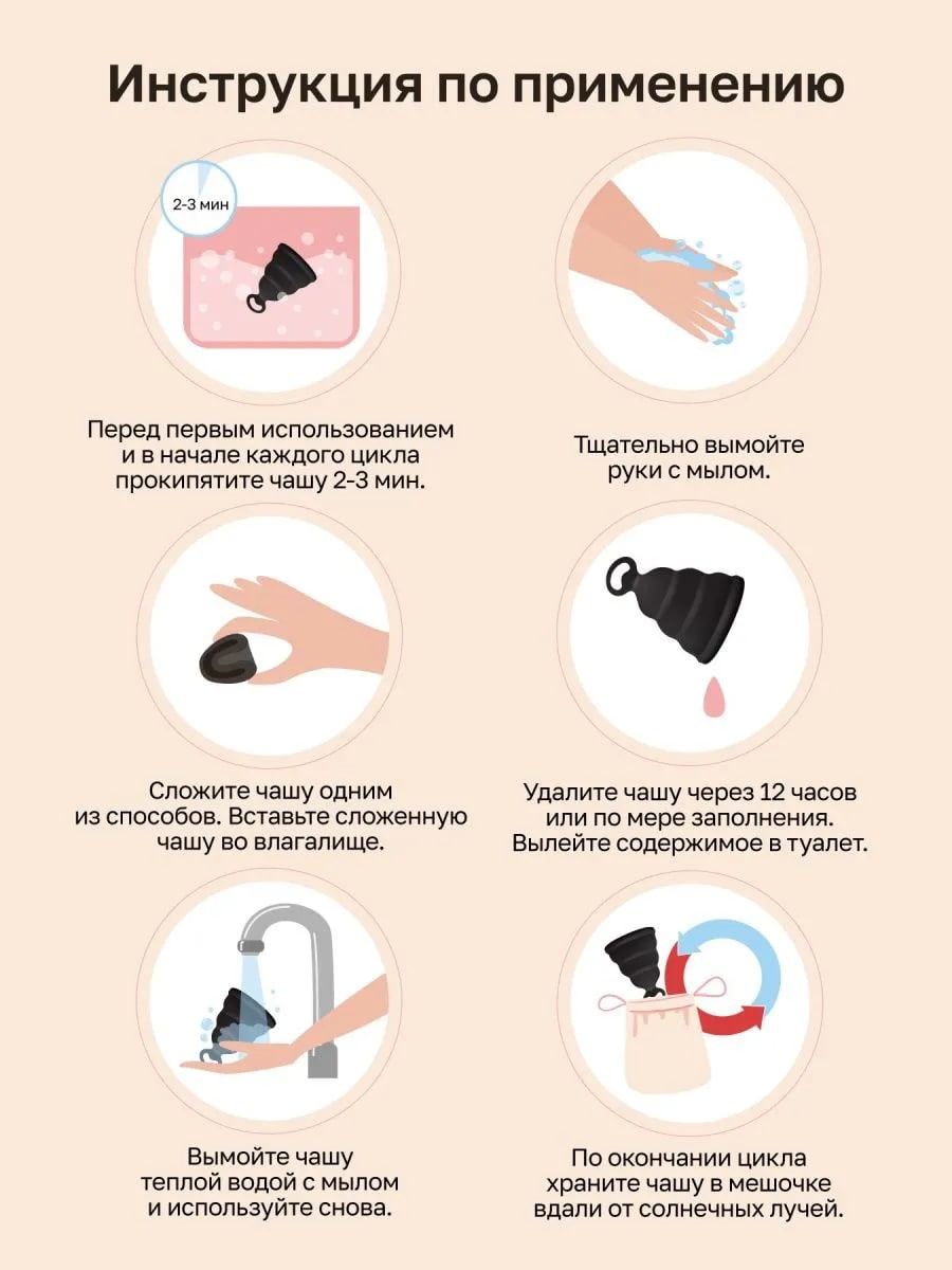 После цикла тщательно вымой чашу с мылом и высушить на воздухе. Для идеальной чистоты рекомендуем специальные средства для ухода — они продлят срок службы до 10 лет. Не кипяти и избегай микроволновки, чтобы чаша оставалась твоим верным другом надолго!