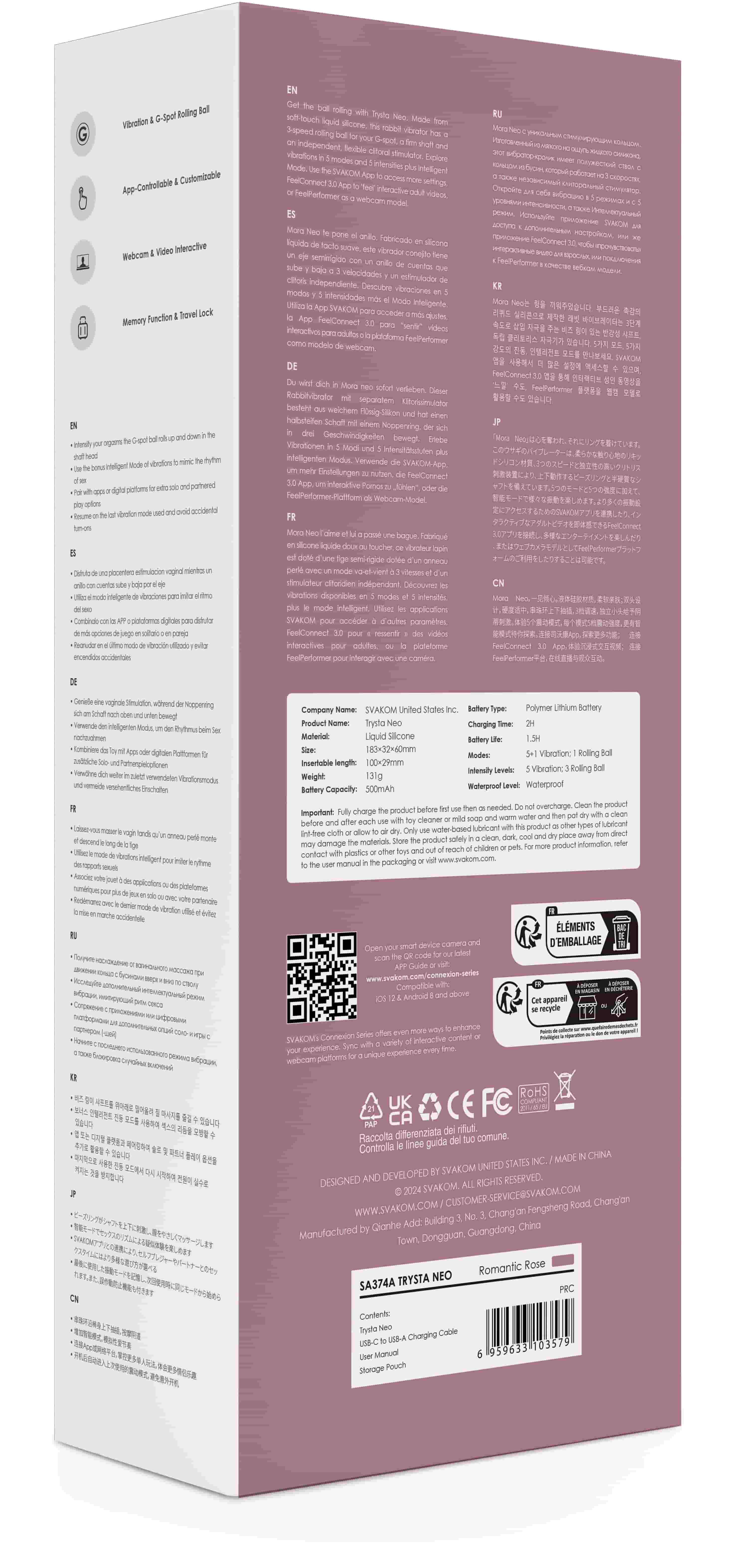 Trysta Neo работает почти бесшумно — всего 47 дБ на максимуме, так что ты сможешь полностью расслабиться и сосредоточиться на волнах удовольствия без лишних отвлекающих звуков.