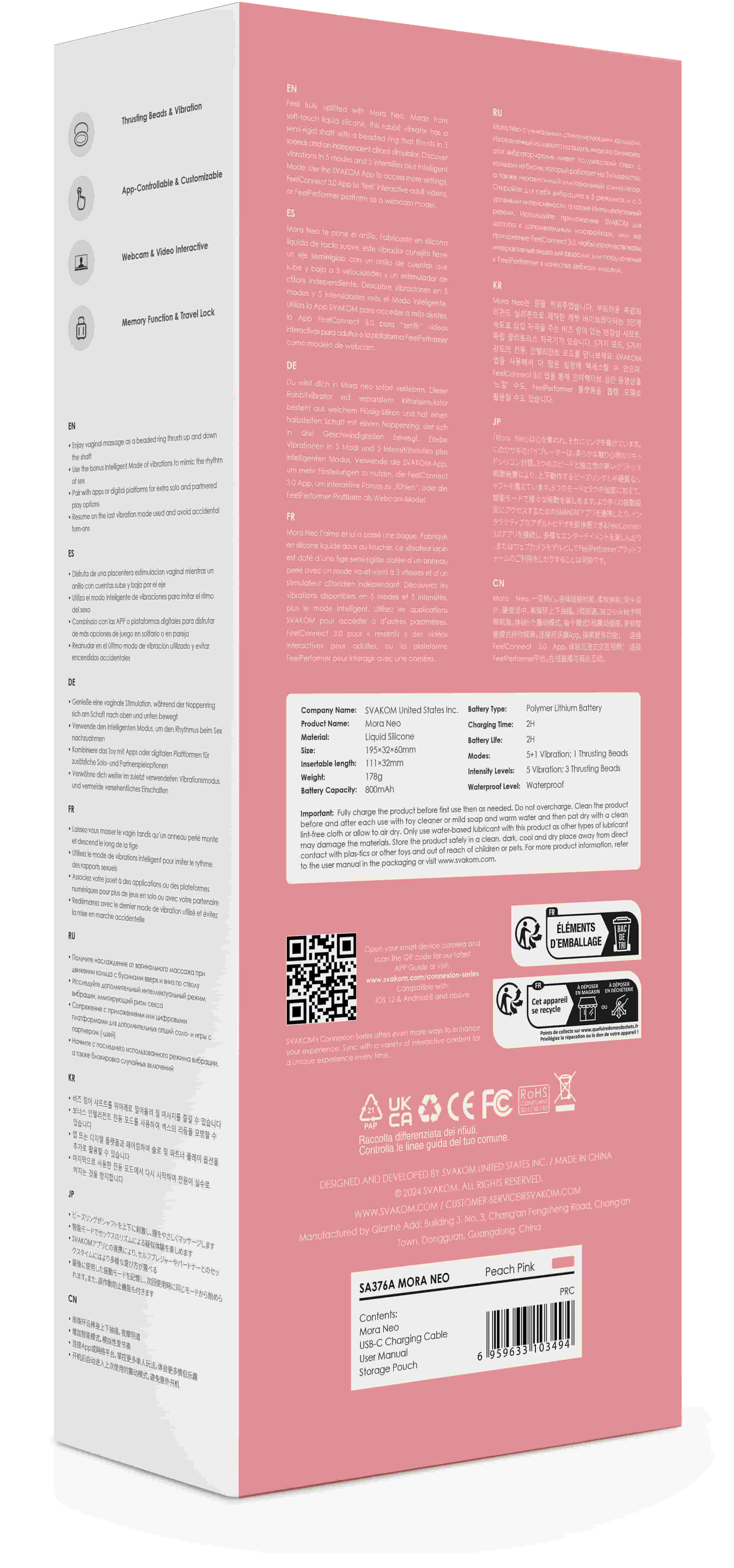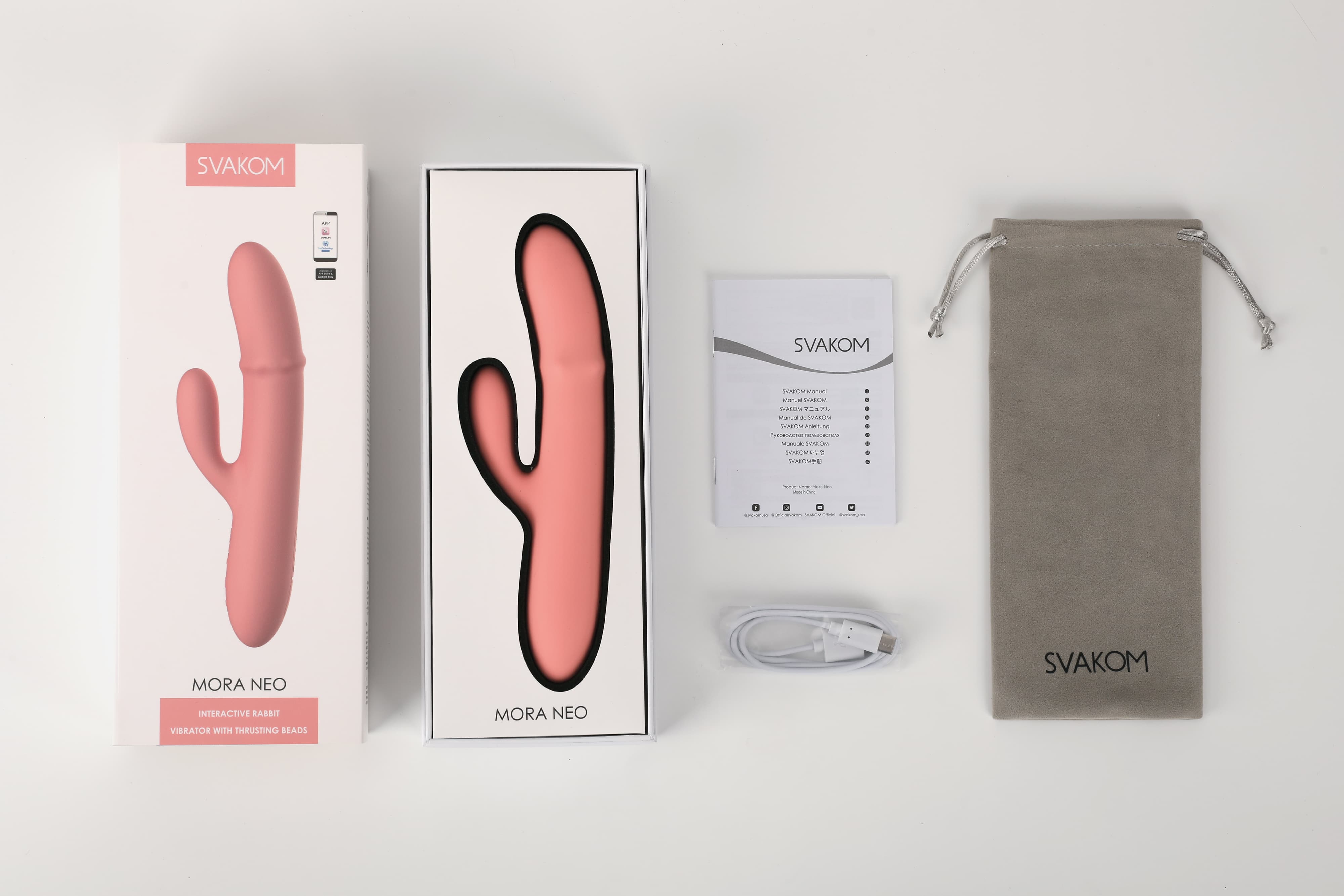 В коробке: вибратор Svakom Mora Neo, USB-зарядное устройство для 2 часов непрерывного удовольствия, руководство по использованию и гарантию на 12 месяцев. Всё, чтобы ты могла сразу окунуться в наслаждение без лишних хлопот.
