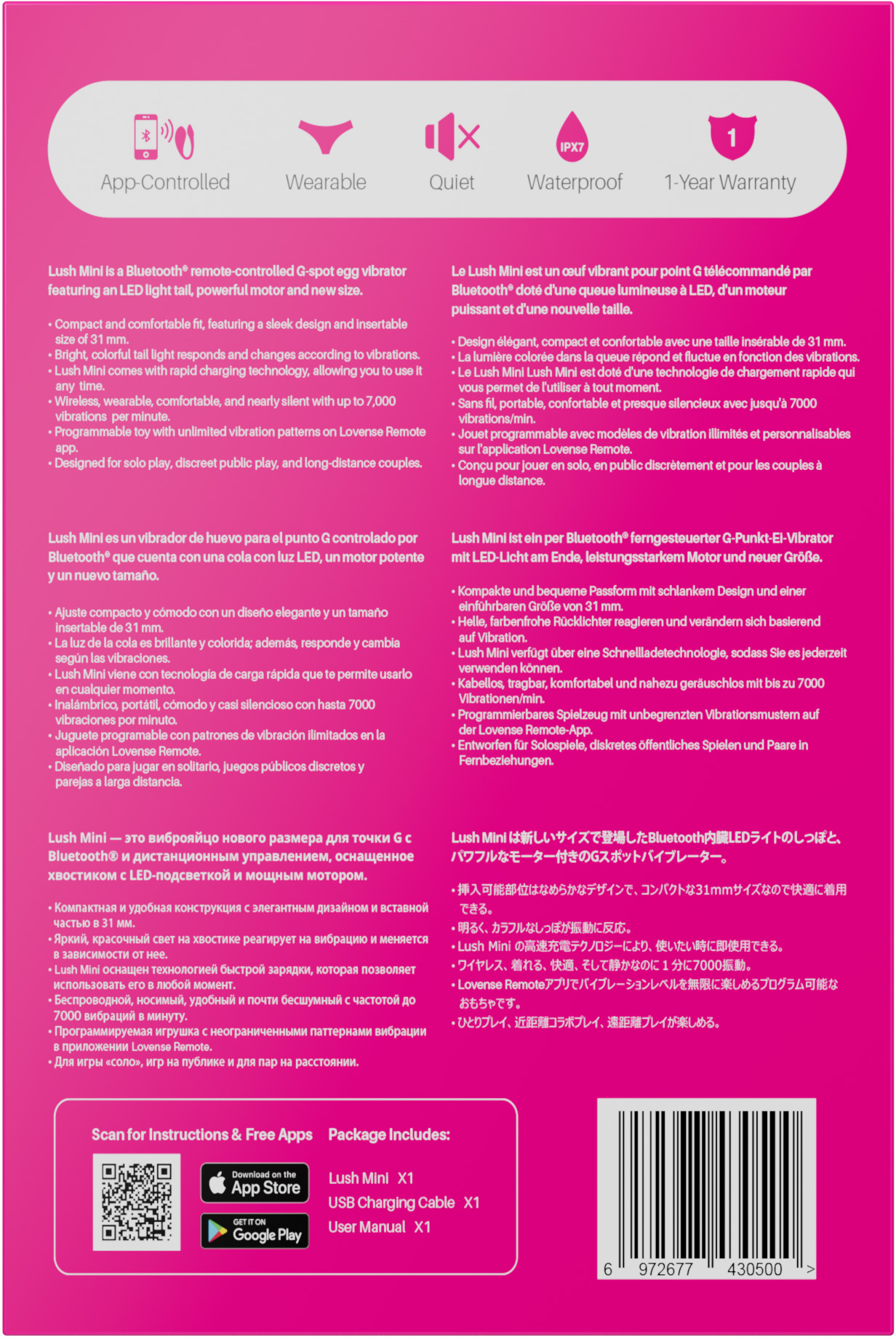 В комплекте: виброяйцо Lush Mini, USB-кабель для зарядки, инструкция по использованию и гарантию 12 месяцев. Все готово для твоих первых шагов в мир вибрационного блаженства!