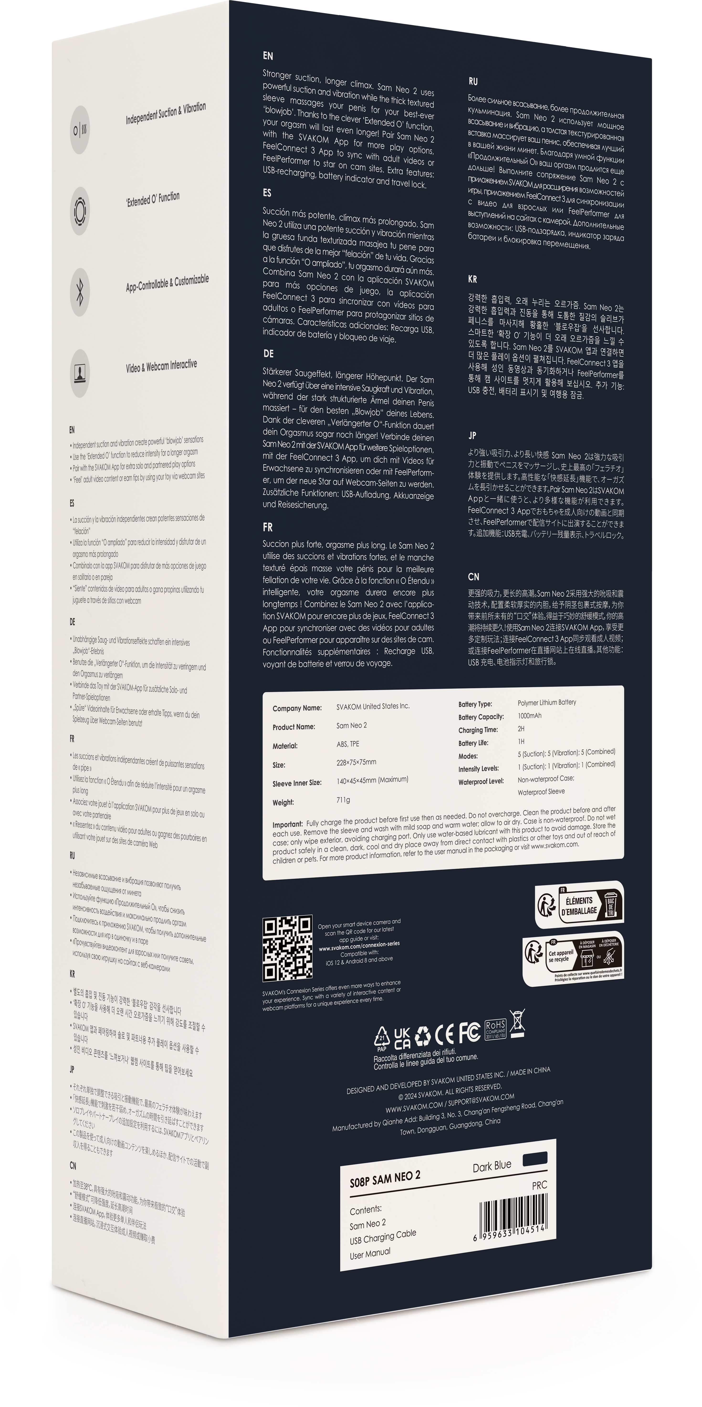 В коробке вы найдете мастурбатор Svakom Sam Neo 2, USB-кабель для зарядки, инструкцию по использованию и гарантию 12 месяцев — все необходимое для немедленного старта вашего пути к ярким эмоциям.