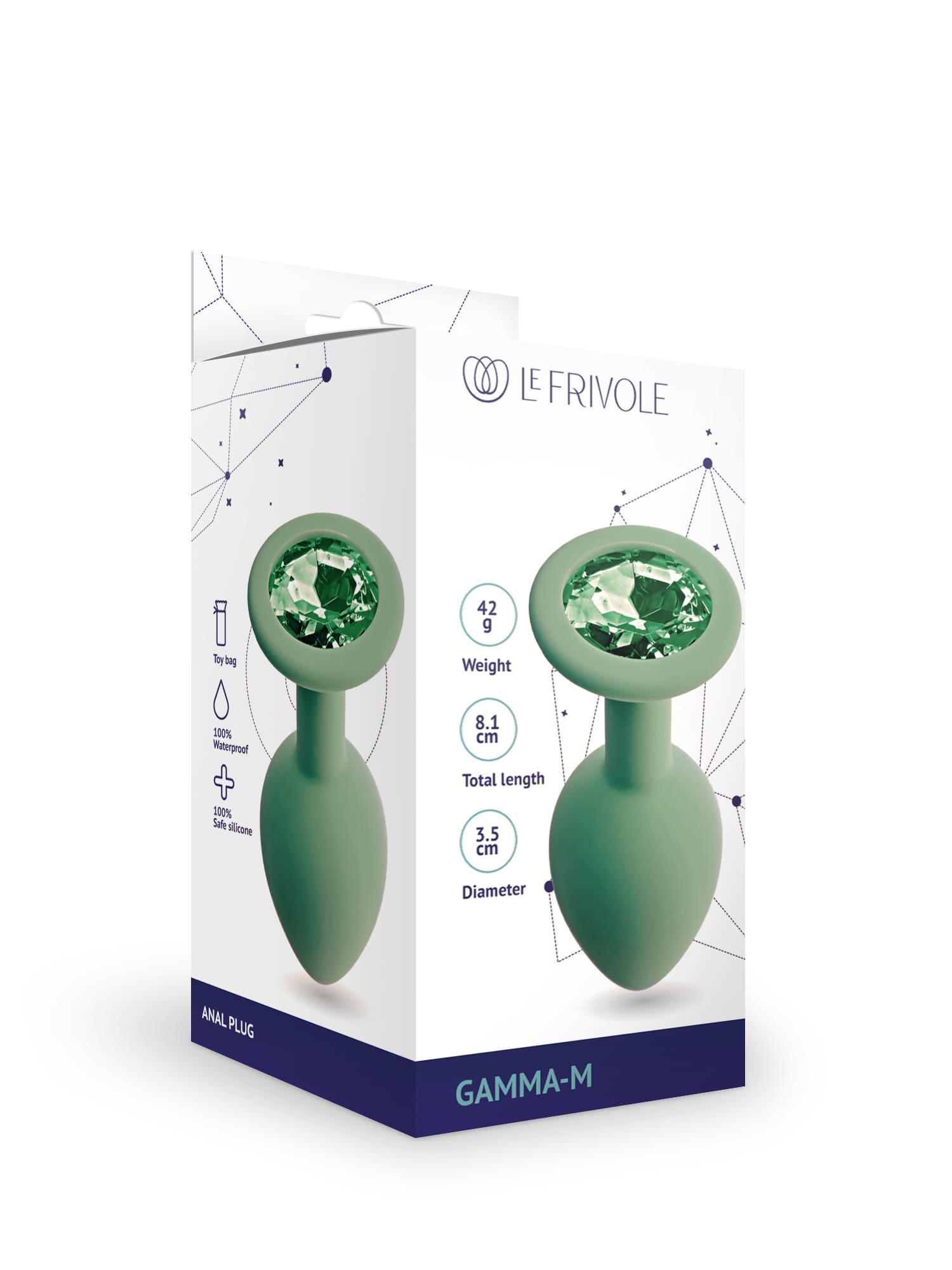 Анальная втулка с зеленым кристаллом Gamma, M, L 7,3 см, Ø 3,5 см, цвет салатовый