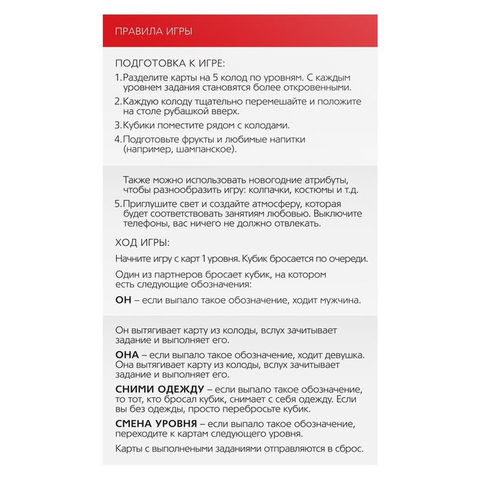 Игра проста: бросьте кубик для определения действия, вытяните карту с заданием и следуйте ему вместе. Нет нужды в инструкциях — интуиция и страсть поведут вас, создавая спонтанные моменты удовольствия без усилий.