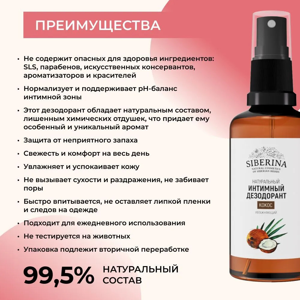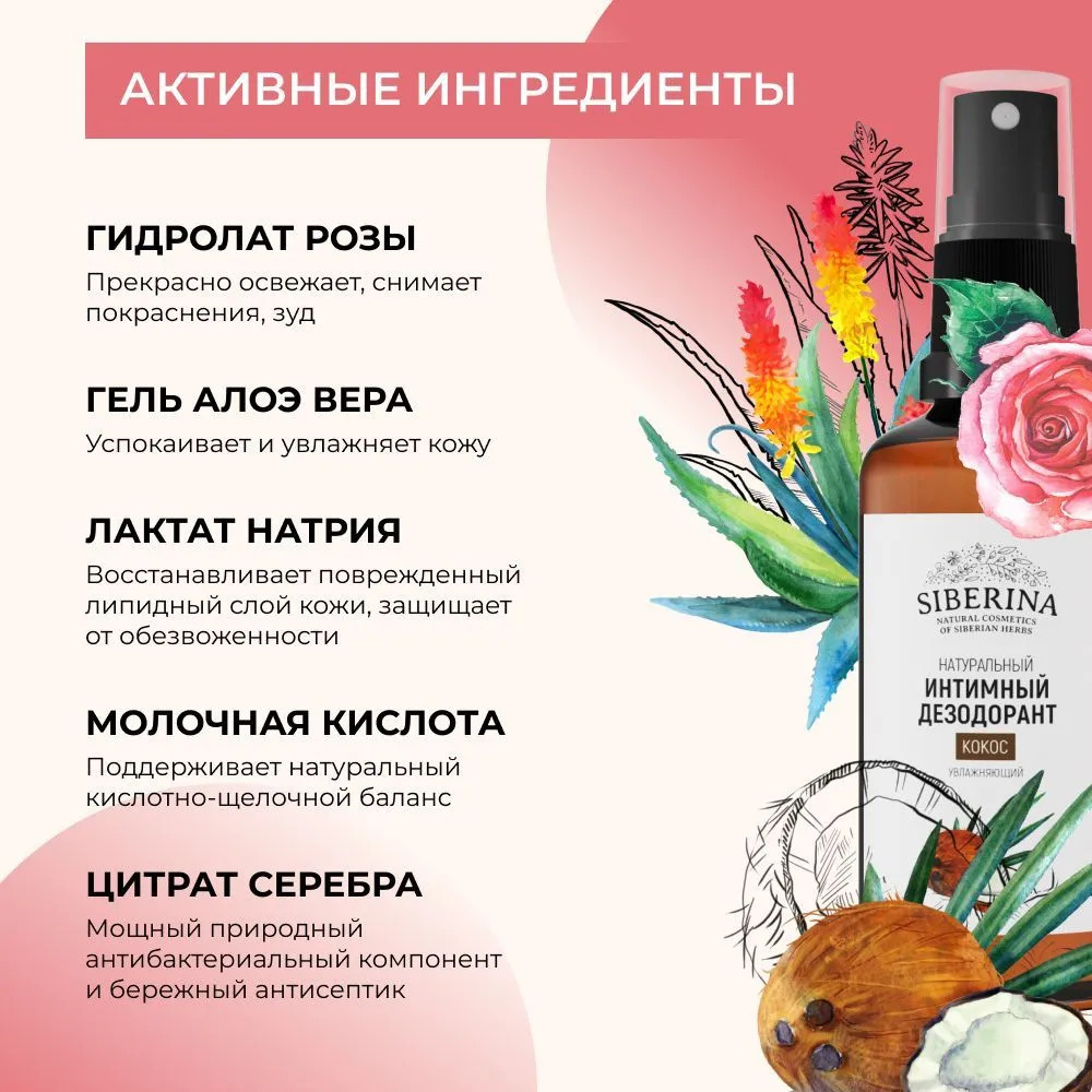 Добавьте в свою жизнь нотку тропической страсти с интимным дезодорантом Siberina! Просто распылите перед близостью или в любой момент, когда хочется почувствовать свежесть и соблазн. Этот спрей не только ухаживает за вашей интимной зоной, но и усиливает удовольствие от прикосновений, делая каждую встречу яркой и незабываемой. Не упустите шанс окунуться в мир чувственных ощущений — закажите сейчас и позвольте кокосовому аромату разжечь огонь желания!