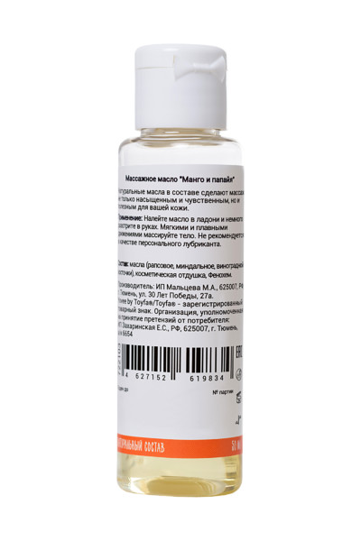 Это натуральное масло на основе растительных экстрактов манго и папайи, которое легко наносится и обеспечивает идеальное скольжение для массажа. Оно увлажняет кожу, усиливает ощущения и создает атмосферу страсти — просто нанеси на тело и наслаждайся каждым прикосновением!