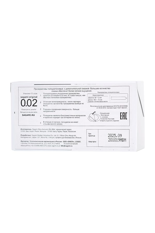Презервативы SAGAMI, ORIGINAL 0.02, EXTRA LUB, полиуретан, L 19 см, Ø 5,8 см, № 12