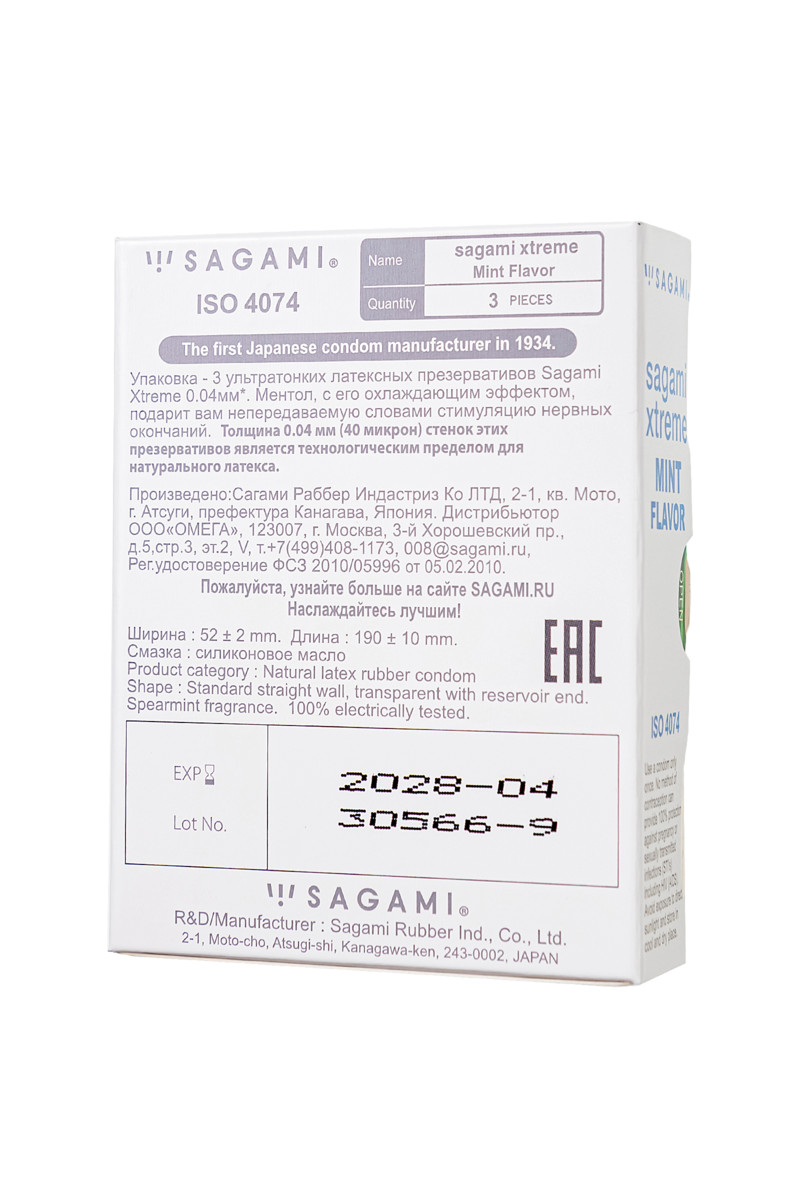 В упаковке — 3 презерватива Sagami Xtreme Mint стандартного размера (ширина 52 мм), готовые к использованию с мятным ароматом для мгновенного усиления ощущений.