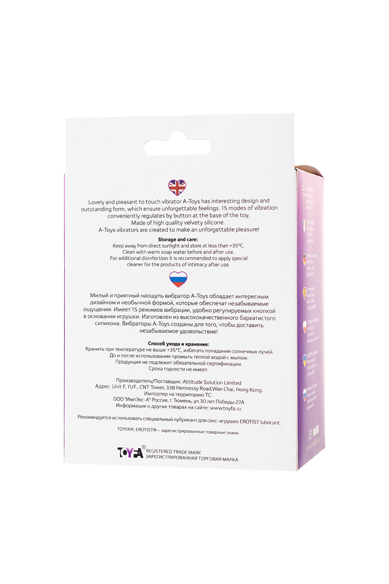 Погрузись в океан ярких эмоций с вибратором A-Toys by TOYFA Fash! Этот стильный и мощный помощник сочетает в себе изысканный дизайн и передовые технологии, чтобы каждое прикосновение превращалось в взрыв удовольствия. С клиторальным стимулятором он дарит двойное наслаждение, заставляя тело трепетать от восторга. Идеален для тех, кто жаждет новых высот страсти — просто включи и позволь себе раствориться в волнах экстаза!