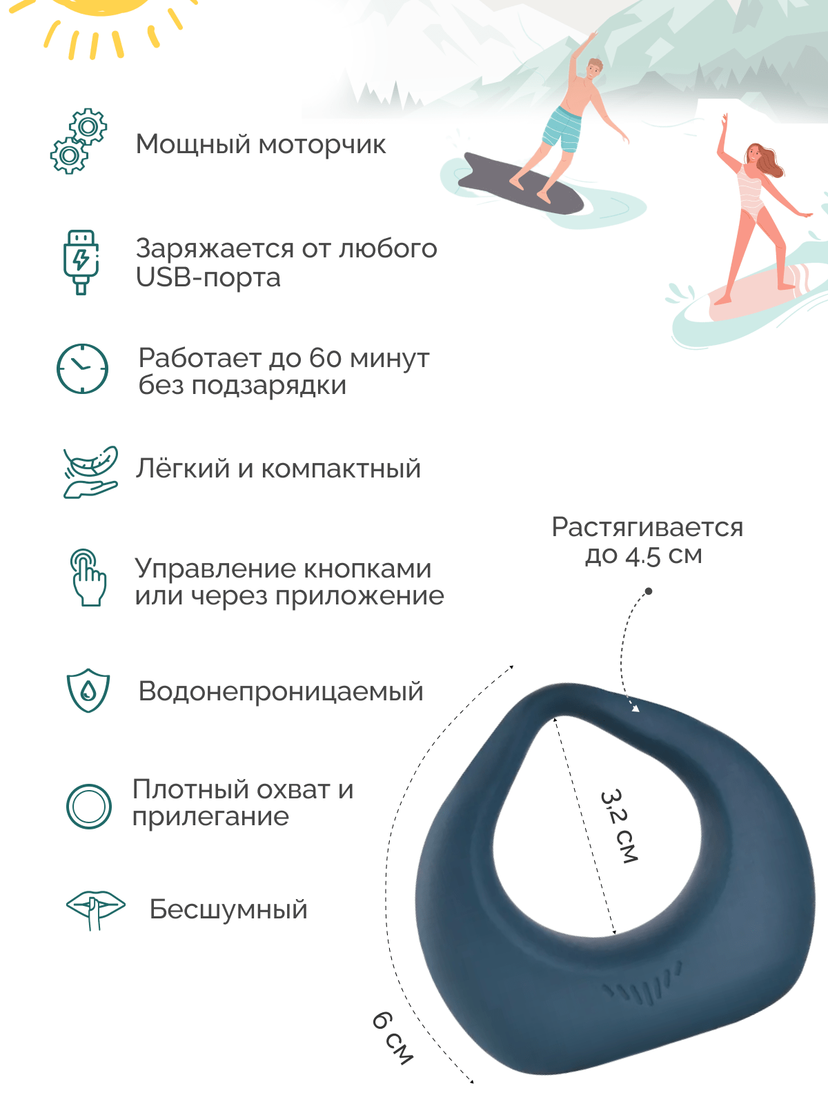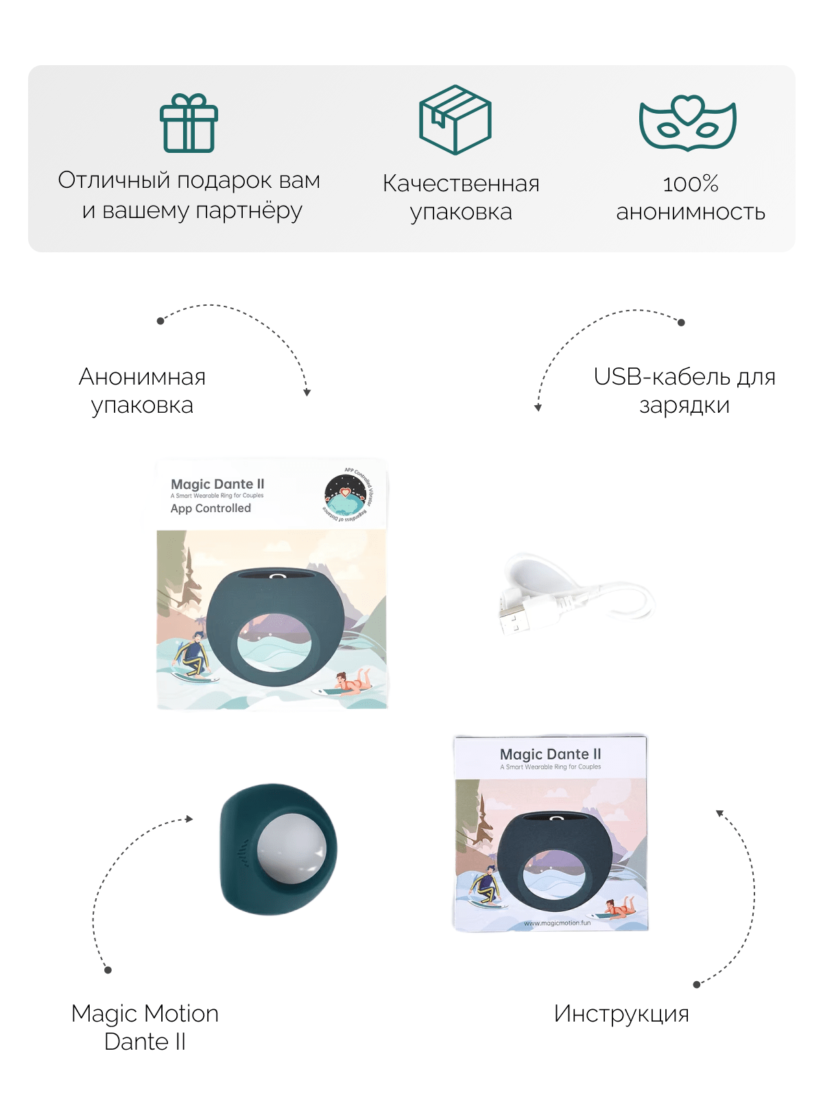 В коробке — само виброкольцо, USB-кабель для зарядки и инструкция, чтобы вы могли сразу нырнуть в волны удовольствия без лишних хлопот.