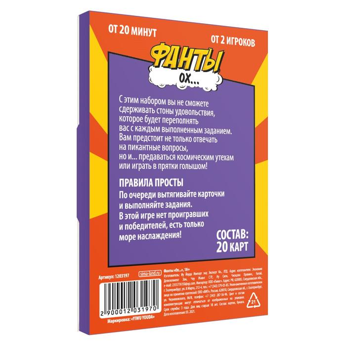 Представь: вечер, полный искр и неожиданных поворотов, где каждая карта раскрывает новые грани твоей фантазии. Фанты «Ох...» — это 20 ярких идей, которые разожгут огонь страсти, добавят игривости в твои отношения и подарят незабываемые моменты экстаза. Готова нырнуть в океан наслаждения? Эти карты ждут, чтобы превратить обычный вечер в праздник ощущений!