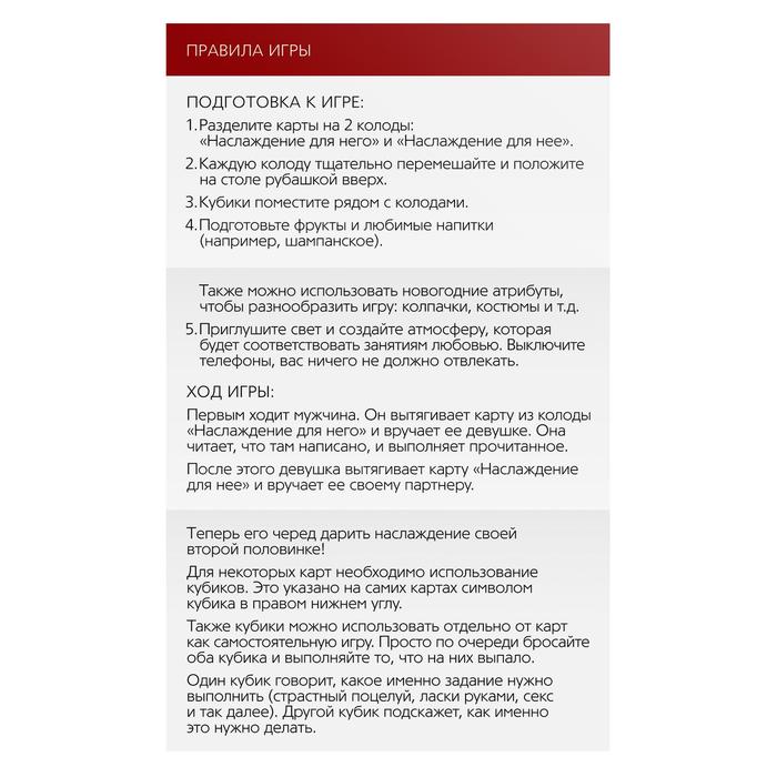 Каждая карта — это вспышка эмоций и новых ощущений, которые разожгут вашу связь и сделают ночь полным погружением в удовольствие, от которого сердце бьется чаще.