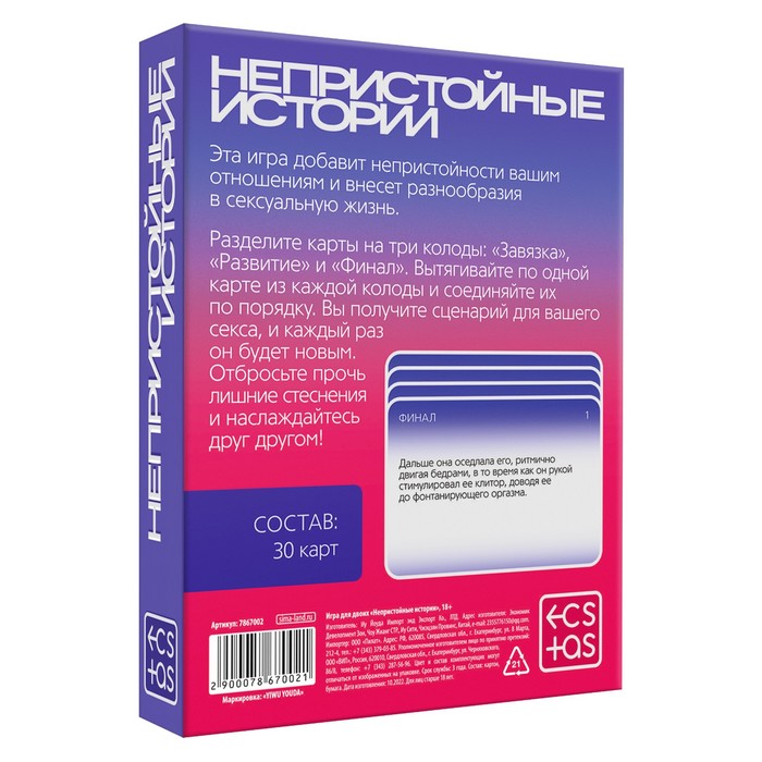 Представьте: вы с партнером в уютной атмосфере, карты в руках, и каждый ход раскрывает новые грани желания. «Непристойные истории» — это искрящаяся игра, где смелые вопросы и задания разжигают огонь страсти, превращая обычный вечер в вихрь эмоций и близости. С 30 яркими картами вы погрузитесь в мир интимных секретов, смеха и нежных прикосновений, открывая друг друга заново. Готовы к волне удовольствия?