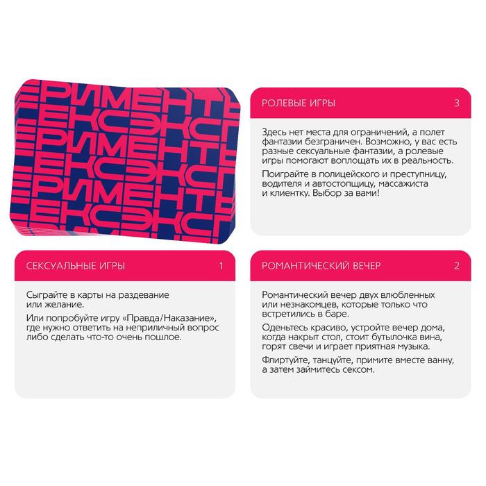 Игра проста и увлекательна: перемешайте колоду из 10 карт, по очереди вытягивайте их и выполняйте указанные эксперименты. Это добавит спонтанности и страсти в вашу близость, помогая открыть новые грани удовольствия без лишних усилий.