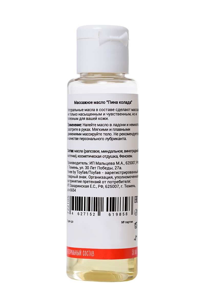 Погрузись в экзотический рай с маслом для массажа Yovee by Toyfa! Этот соблазнительный эликсир с ароматом спелой пина колады окутает твою кожу волнами тропического тепла, превращая каждое прикосновение в незабываемое приключение. 50 мл чистого наслаждения, которое разожжет страсть и подарит часы блаженства — идеально для романтических вечеров или игривых моментов вдвоем. Готовься к тому, что твои ощущения взлетят до небес!