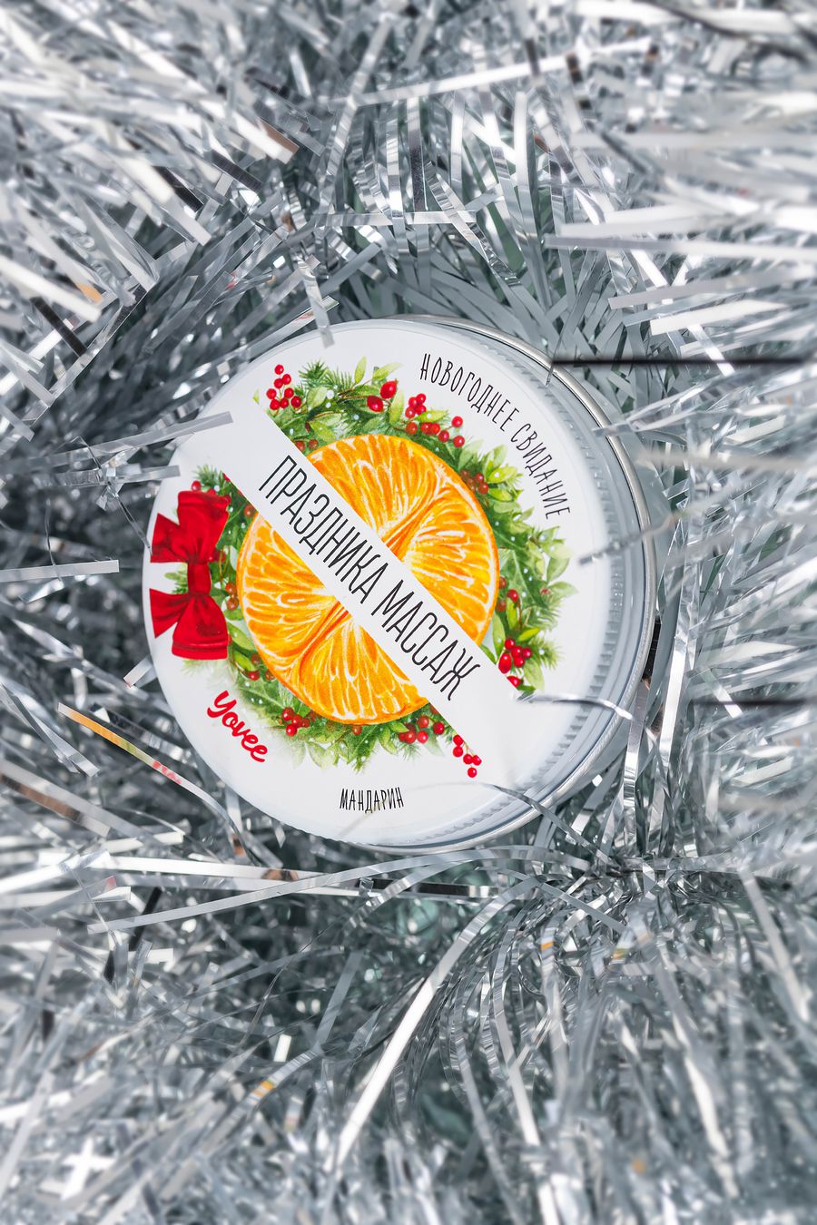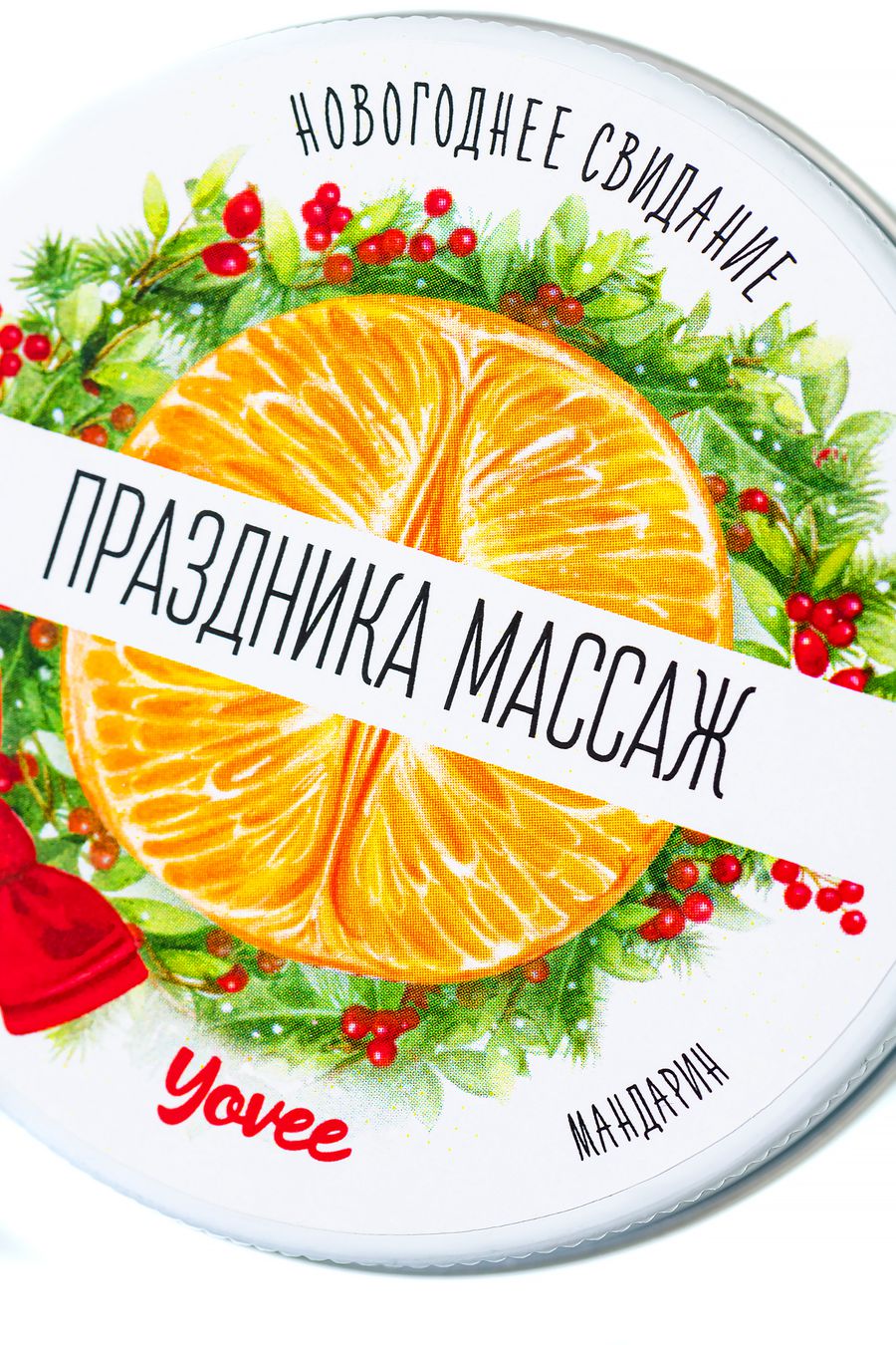 Массажная свеча новогодняя Yovee «Праздника массаж» с афродизиаком, мандарин, 30мл — твой билет в мир новогодних искр страсти и нежных прикосновений!
