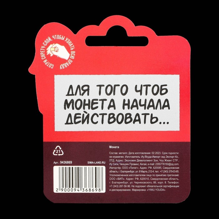 В комплекте только монета диаметром 2,5 см из прочного материала, готовая к немедленному использованию. Она поставляется в стильной упаковке, чтобы сохранить свежесть ощущений.